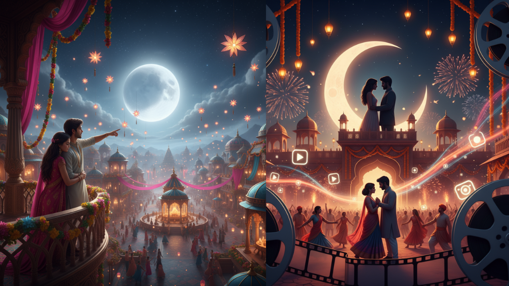 “Romantic festival reveal — woman adjusting her dupatta under moonlight, flickering diyas around, cinematic background blur, soft glowing transitions, peaceful mood.”