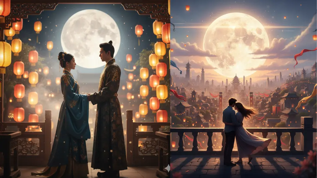 “Moonrise transition over festival skyline, couple watching from balcony, gentle breeze, soft cinematic lighting, emotional tone, lens flare glow.”