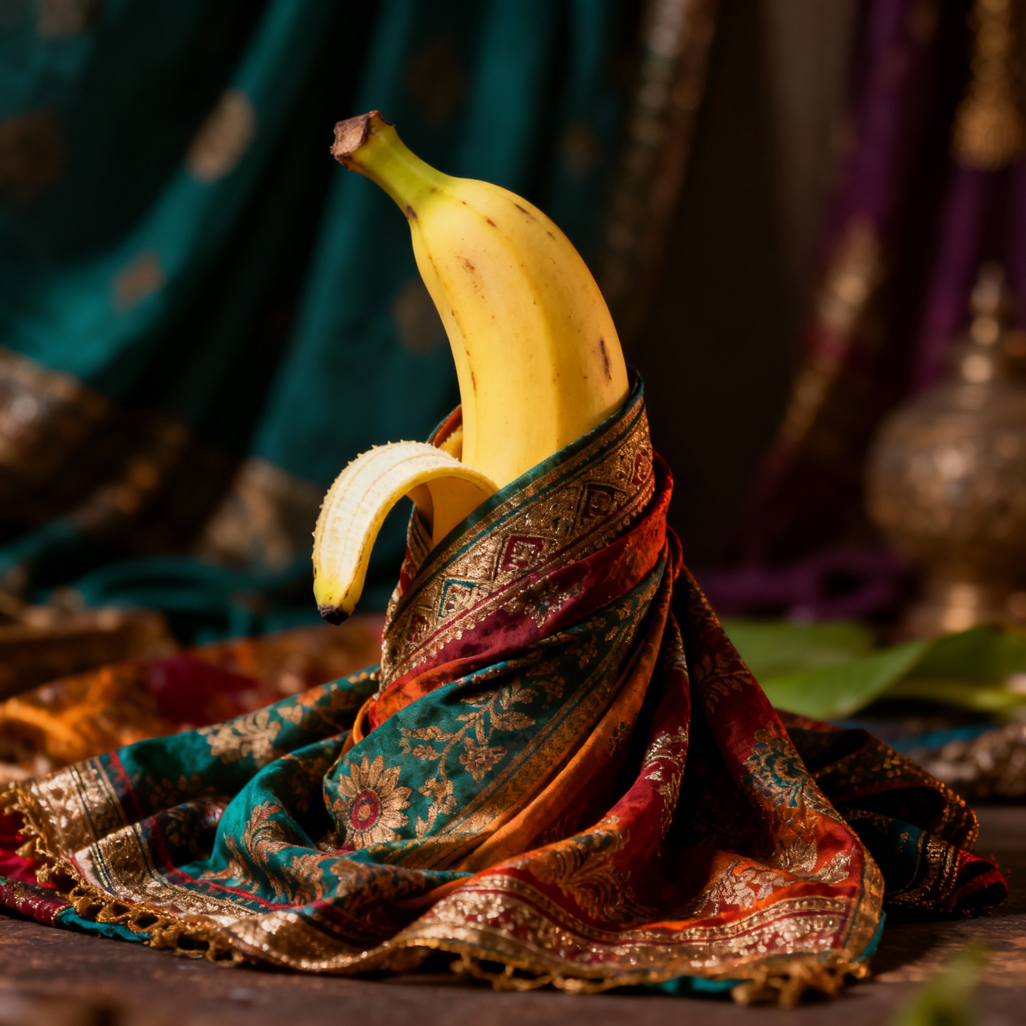 Miniature Nano Banana in a retro saree, cinematic dramatic lighting from side, realistic 3D folds, vintage diorama background, photorealistic effect.